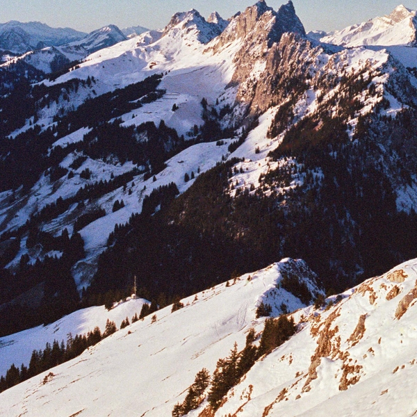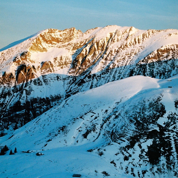 The chalets of the frozen mountain pasture immortalized on an analog film
